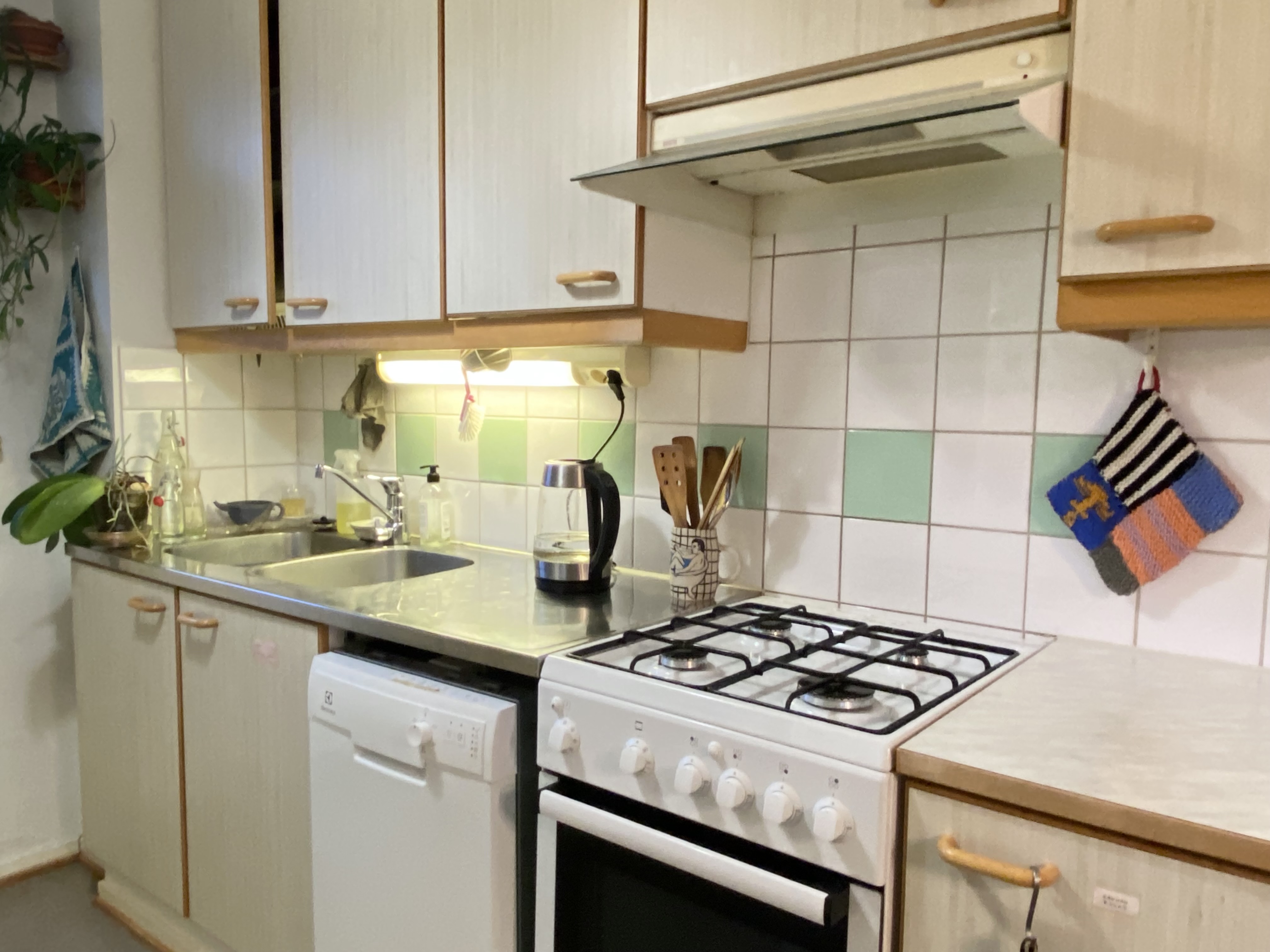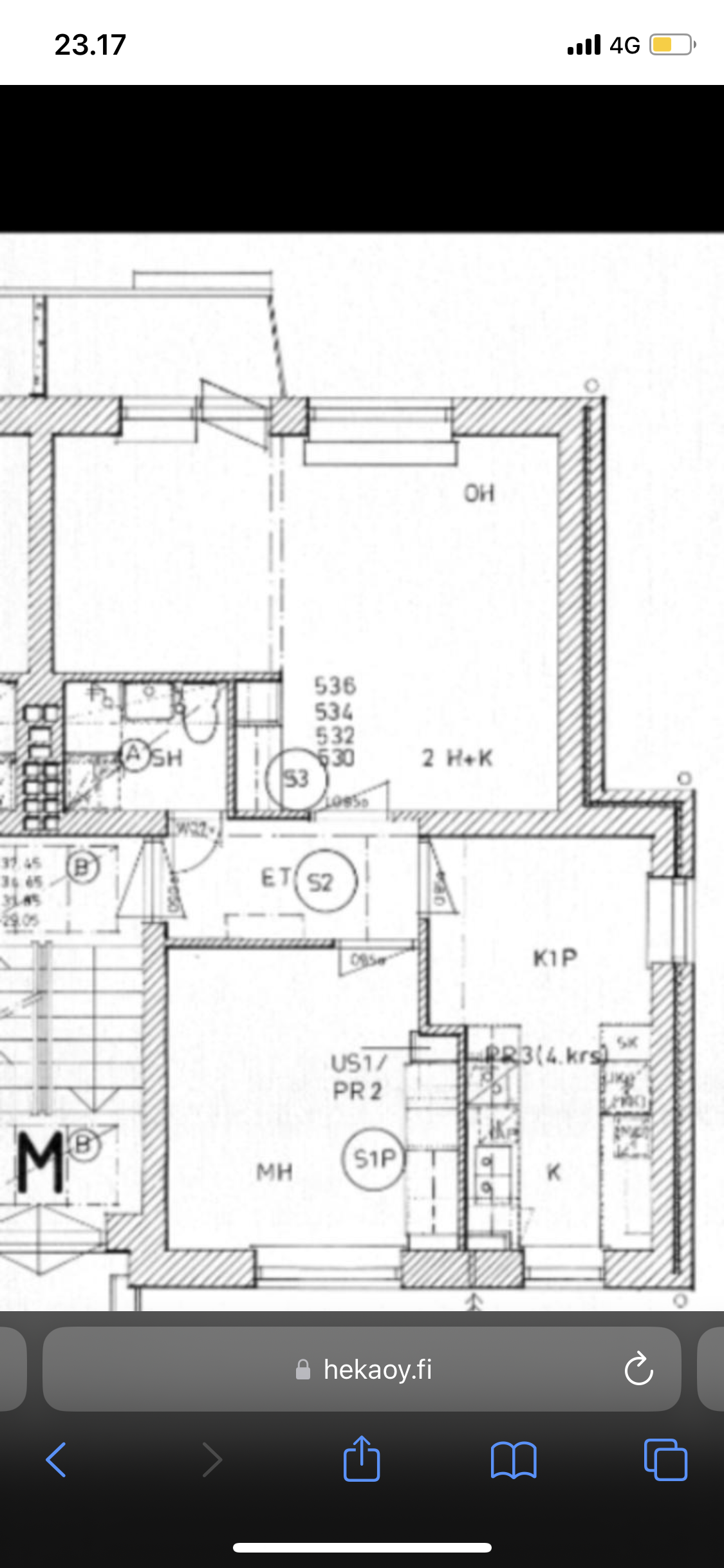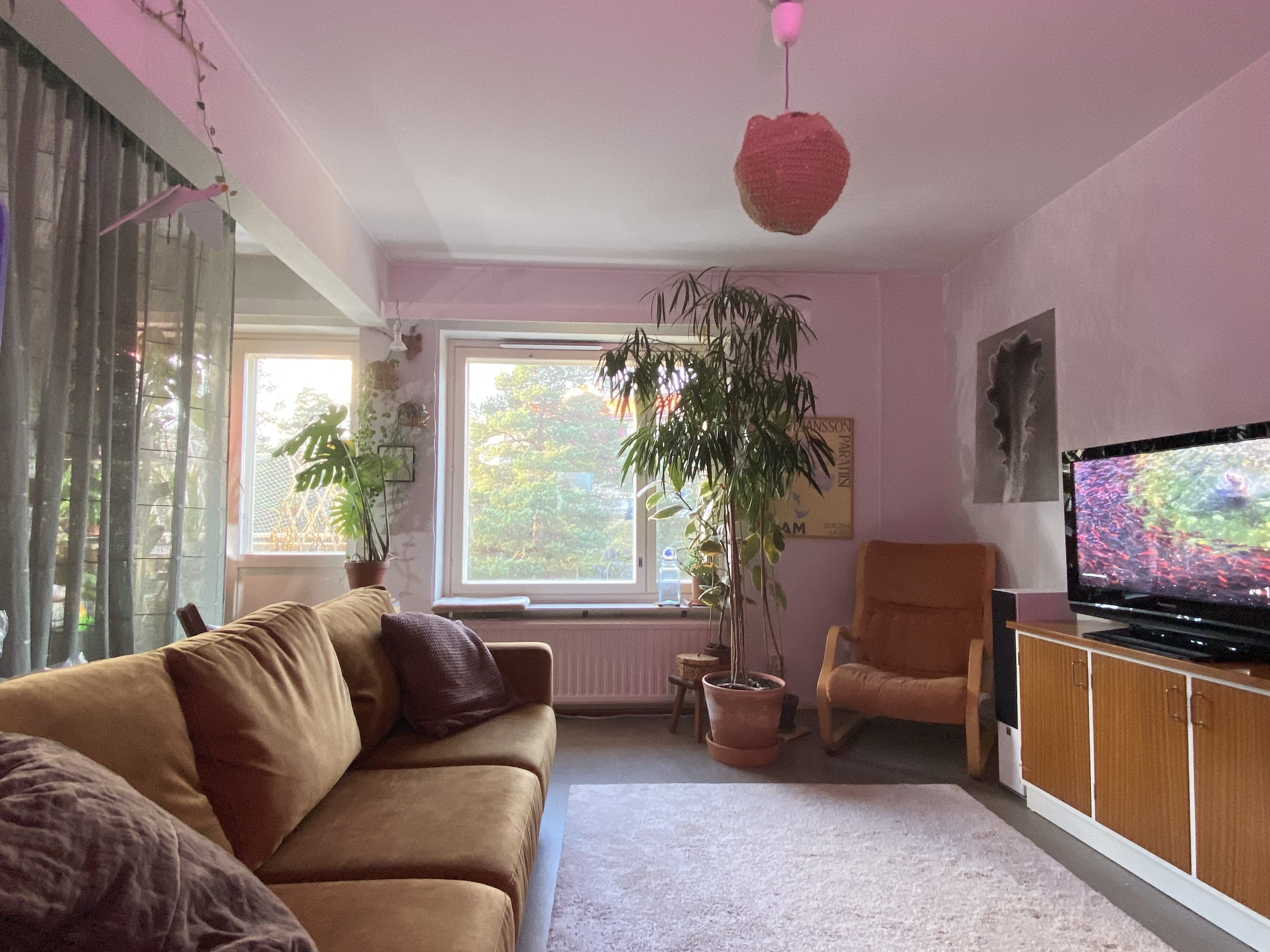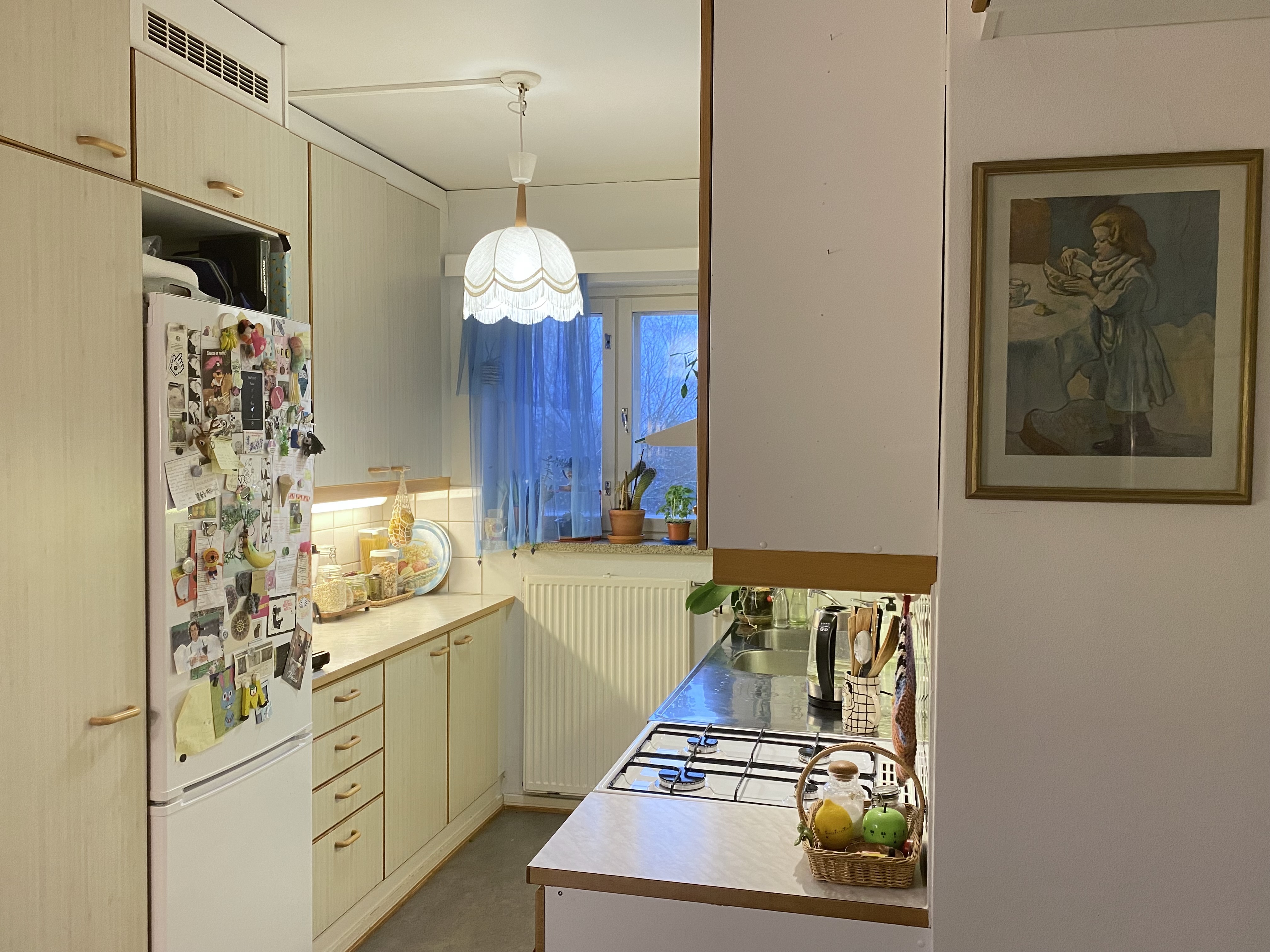 Pinnat ovat vähän aikaa nähneet, mutta yleisilme siisti. Olemme viihtyneet asunnossa hyvin sen avaruuden, rauhallisuuden ja mukavien vehreiden ikkunanäkymien vuoksi. Pohjaratkaisu on toimiva. Keittiössä, olohuoneessa ja makuuhuoneessa on suljettavat ovet. Keittiössä kaasuhella. Pieni parveke talon läntisellä seinustalla.