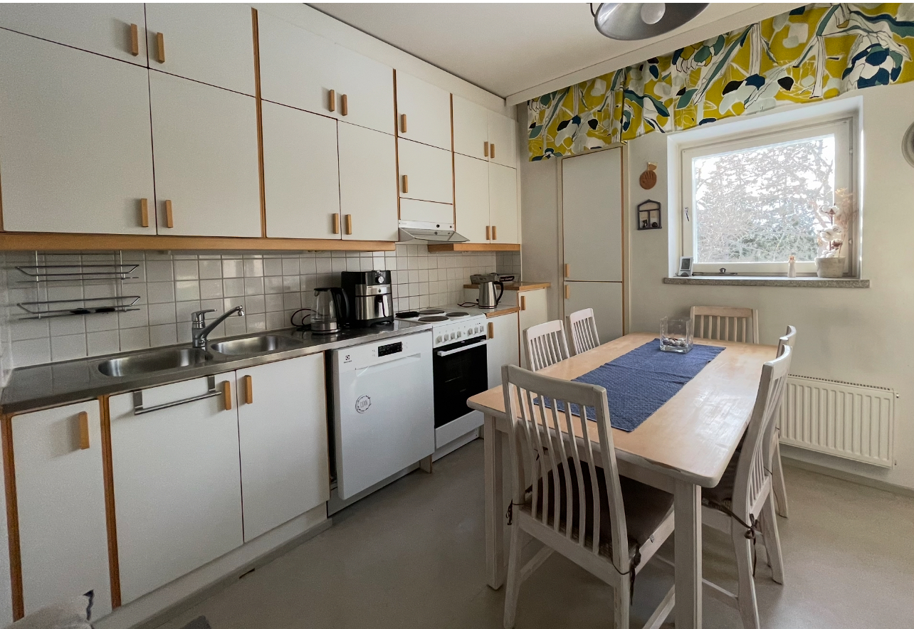 – keittiöön mahtuu hyvin ruokapöytä. Keittiön ja olohuoneen välissä ikkunallinen ovi – mahdollista pitää tilat erillään.