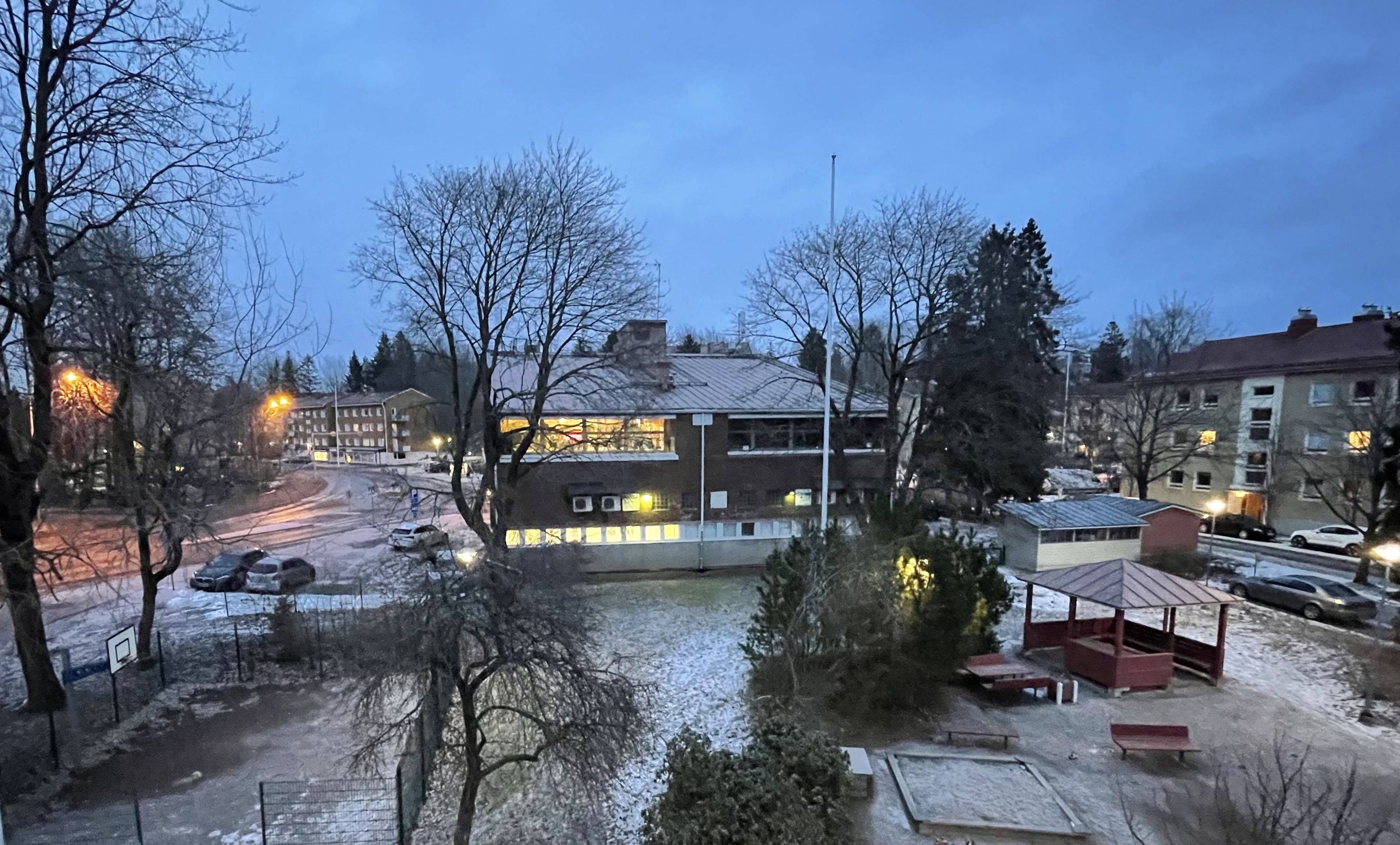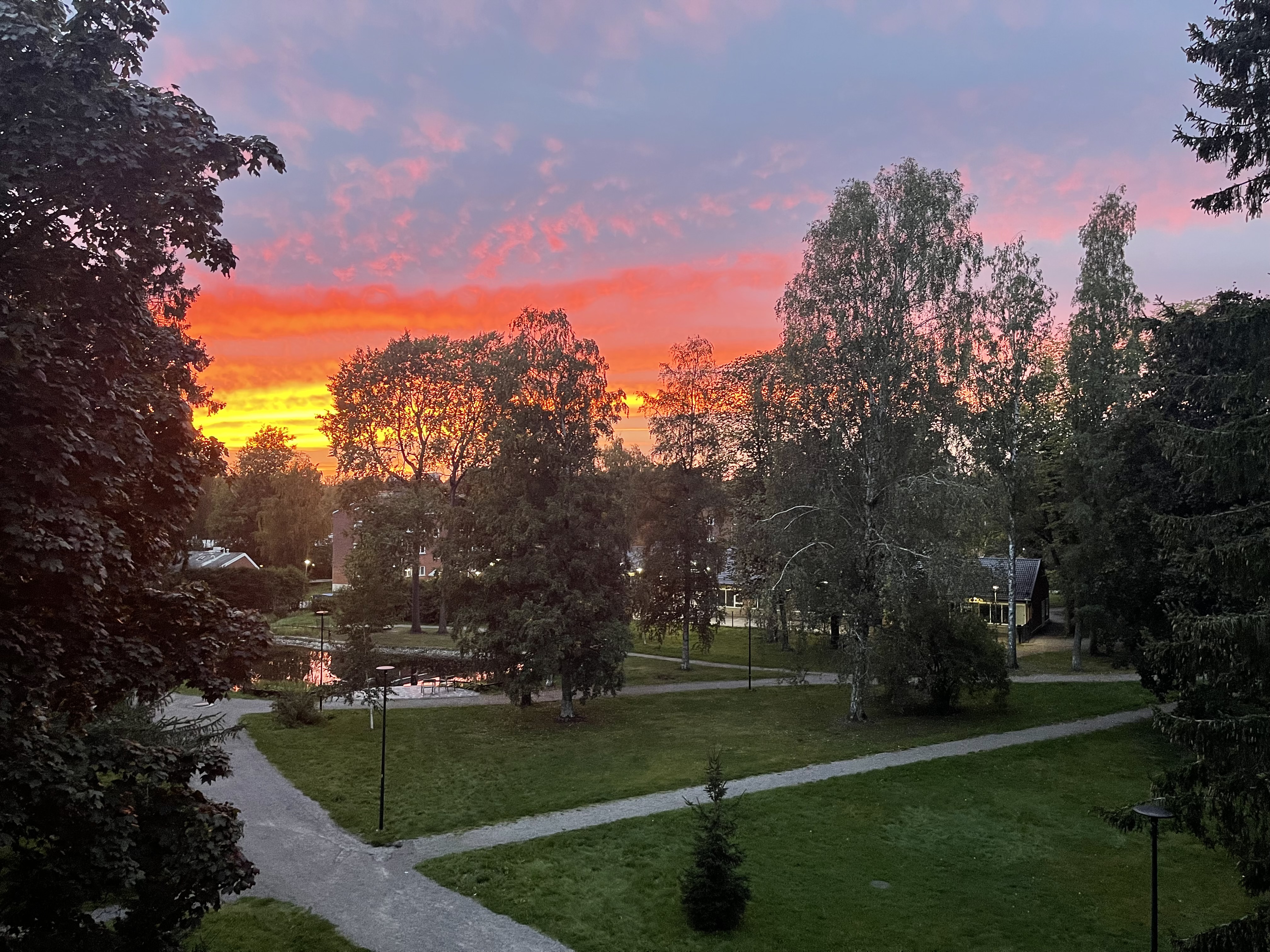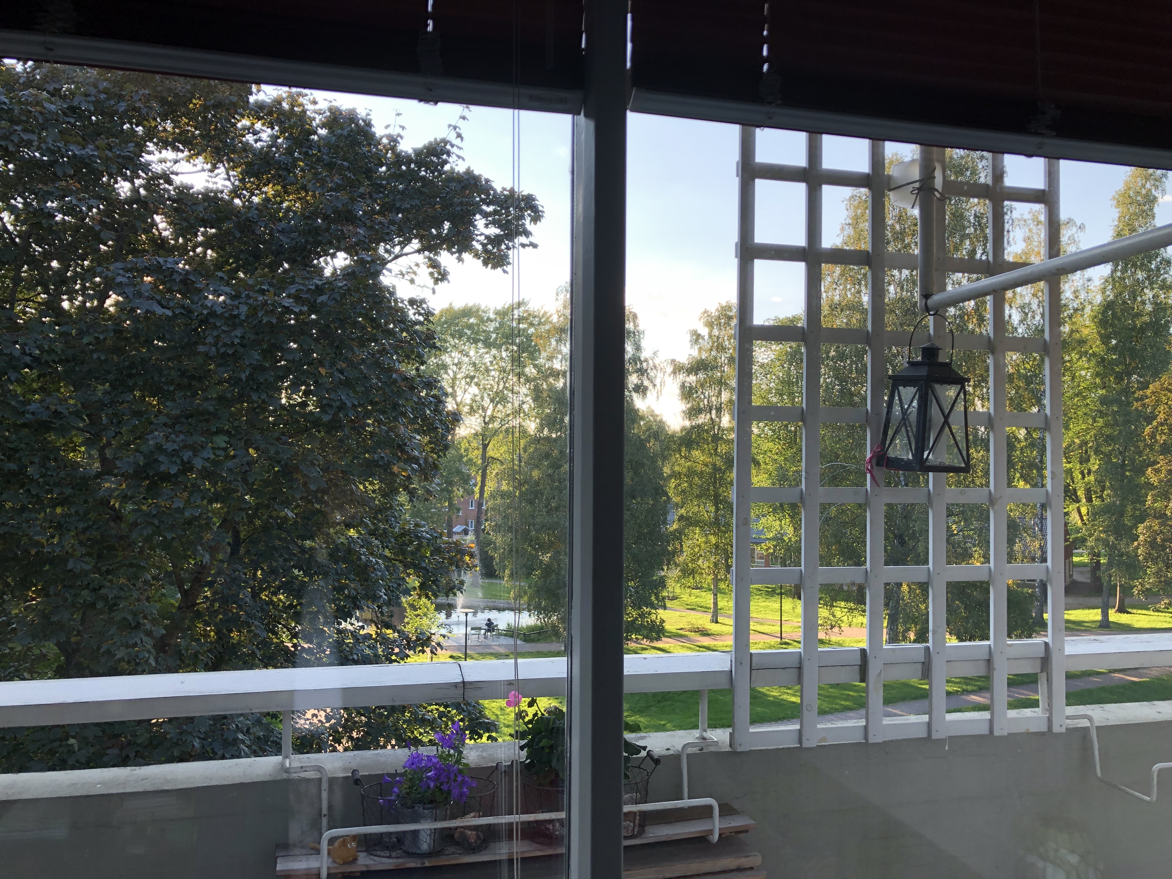– asunnon levyinen parveke länteen isoon puistoon ilta-aurinkoon