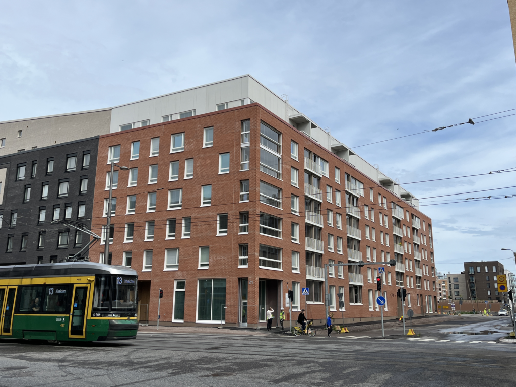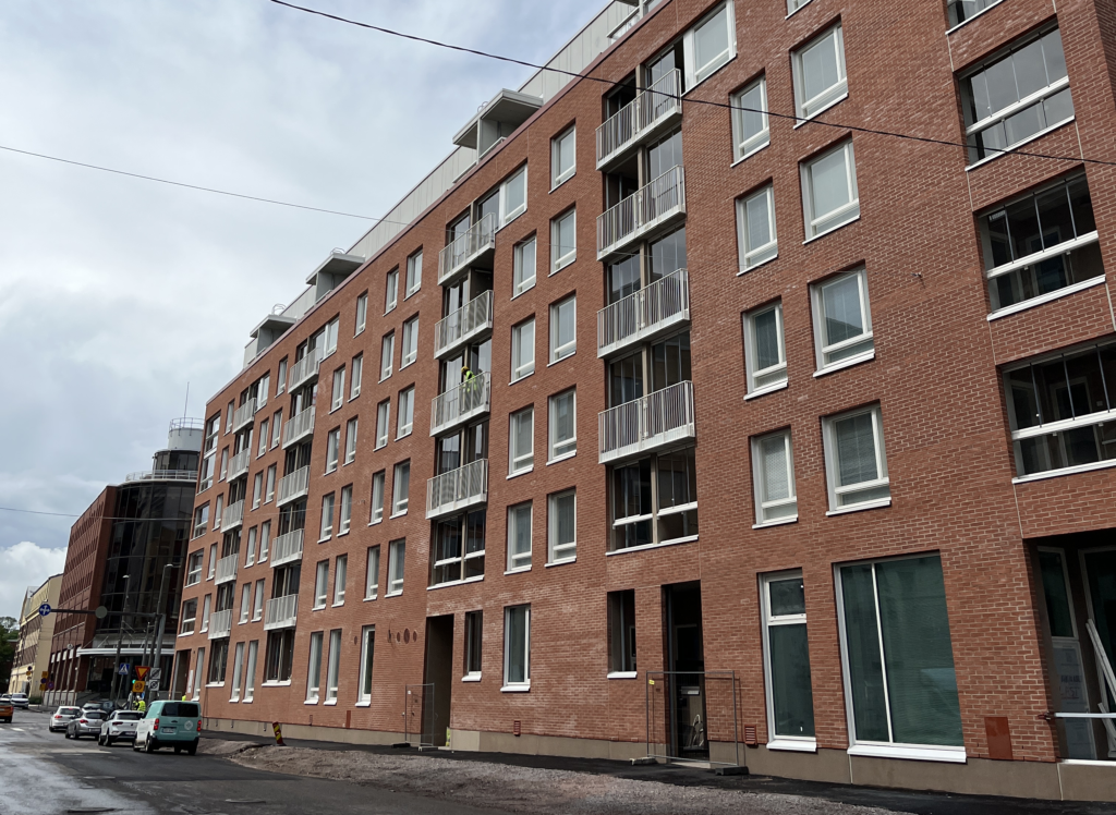 Talon julkisivu on pääosin punertavaa tiiltä. Pääsisäänkäyntien syvennyksissä on puuverhous. Talon katolla on aurinkopaneeleita.