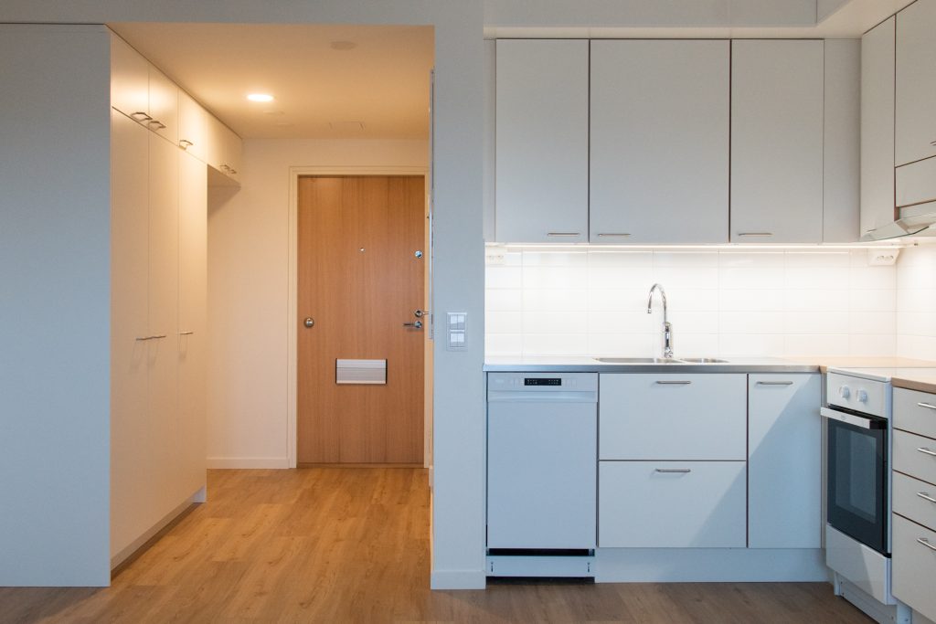 Köken är utrustade med kyl och frys, diskmaskin, ugn, spis och fläkt. Det finns också plats för mikrovågsugn. Bostäderna har ljusa ytor, vinylplankgolv och praktiska keramikplattor i badrummen.