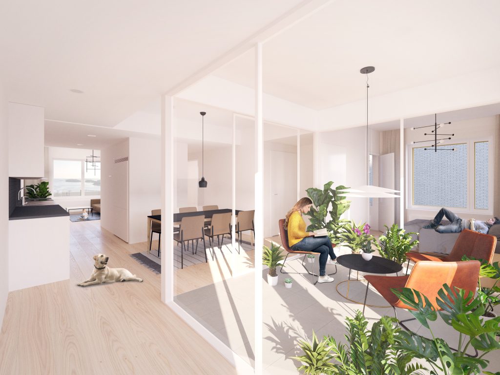 Bostäderna sträcker sig från ettor på 35,5 kvadratmeter till familjelägenheter på över 95 kvadratmeter med fyra rum. Största delen av bostäderna är tvårummare. Bostäderna präglas av ljusa färger och är lätta att inreda. Golven är av vinylplankor och badrummen har keramiska kakelgolv och ett tak med granpanel.